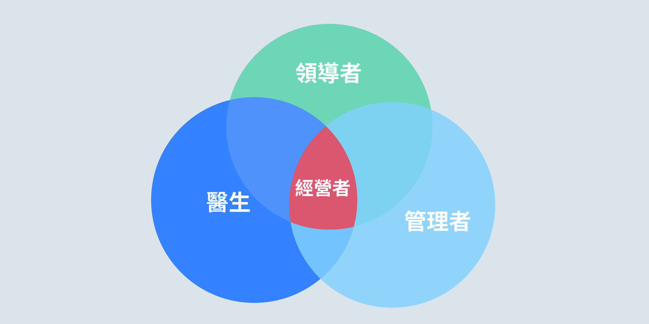 當醫生離開醫院體系後走向開業醫的發展過程中,會面臨一個很大的問題,就是開業醫什麼事都要自己來,面對這樣的問題,必須重新思考個人的角色與定位,如何讓診所在現有的規模下,仍擁有專業的分工與層級分明的組織架構。而角色定位可以分為4種,包括醫生、管理者、領導者以及經營者。