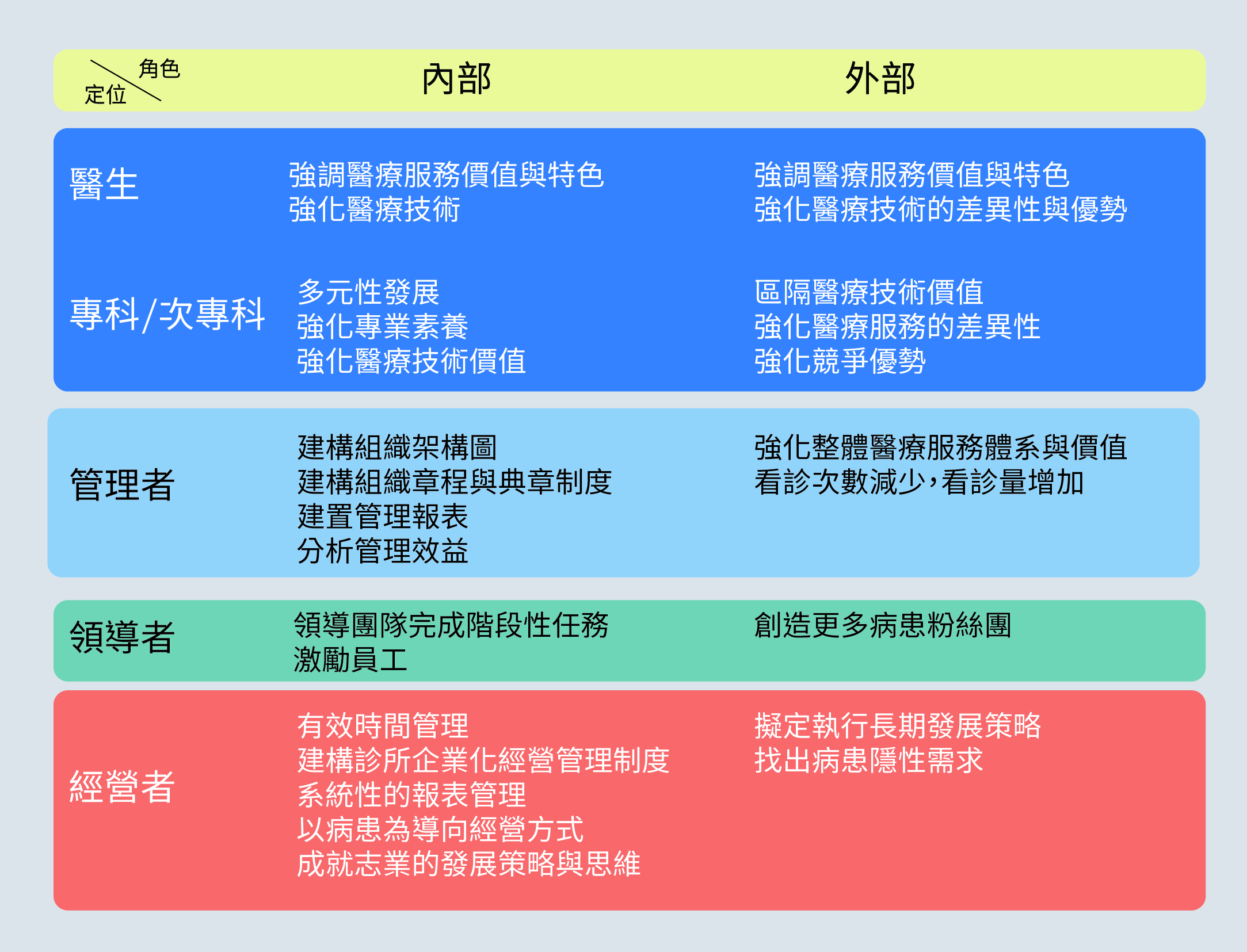 不論是哪種角色,都可以區分為診所外部診所內部兩大部分,且兩者扮演的角色及定位將會截然不同。