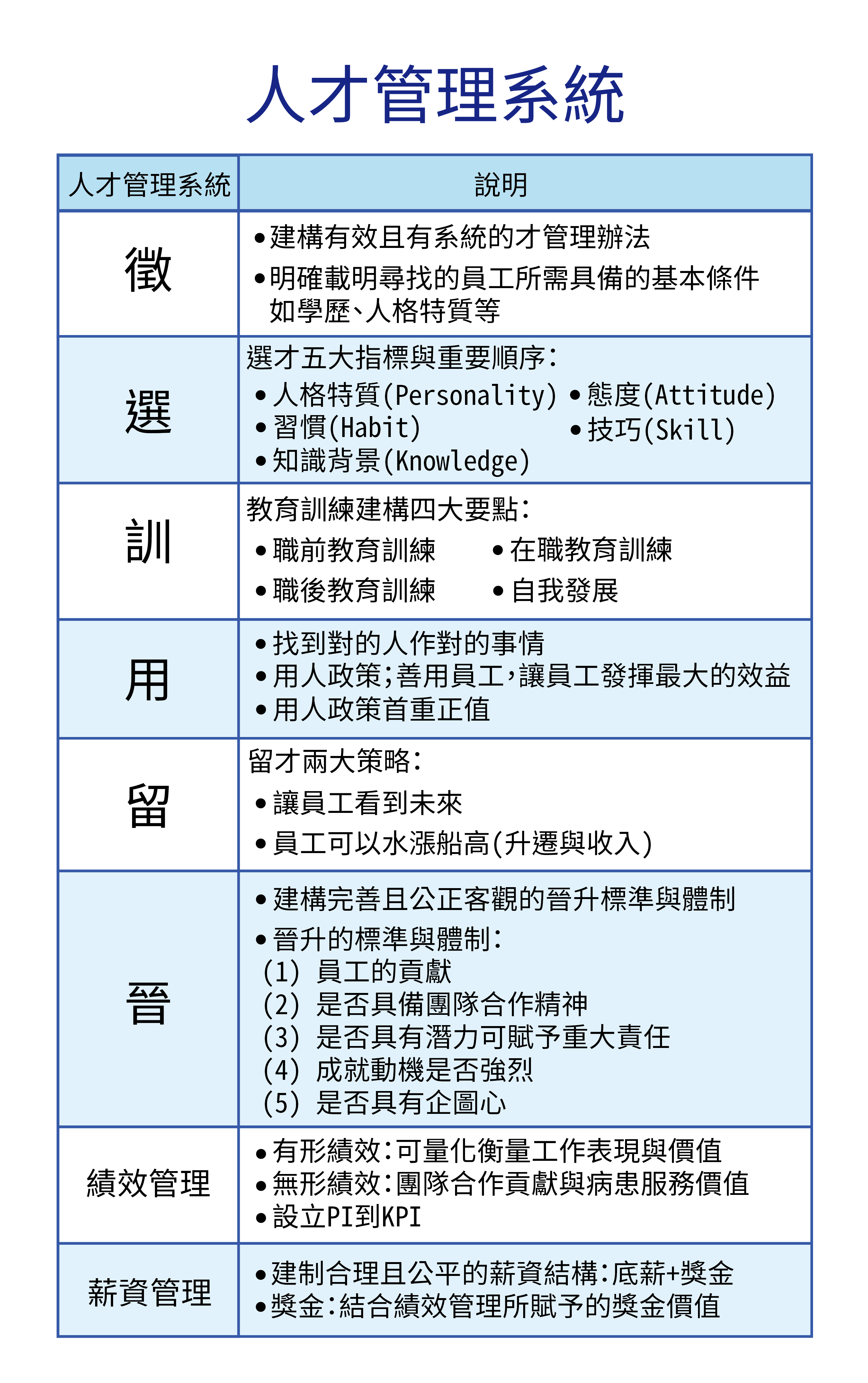 用人應以具體可量化的科學方法去建構一個有系統的人才管理系統,透過「徵、選、訓、用、留、晉到績效管理與薪資管理」來篩選出適合的人。