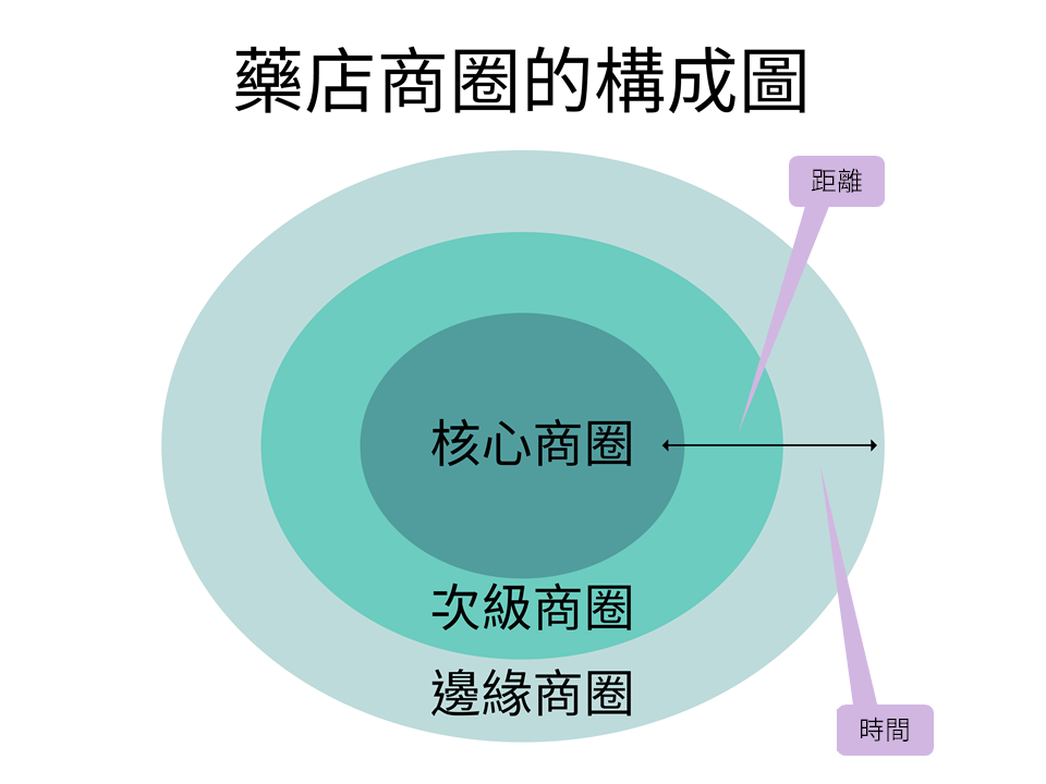 主要商圈是最接近藥店並擁有高密度顧客群的區域,顧客占其總數的55%~70%;次級商圈是位於主要商圈之外,顧客密度較低的區域,顧客占其總數的15%~25%;邊緣商圈是位於次要商圈之外,顧客密度最低的區域,顧客只占其總數的5%~10%。